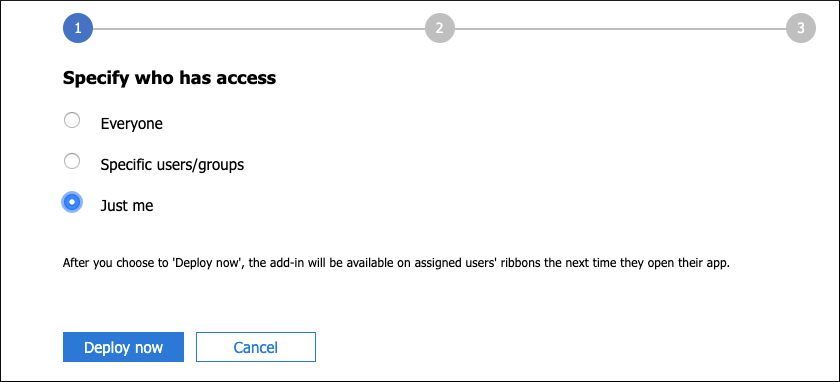 - Specify who will have access to the add-in - everyone, specific users/groups, or just you - then click Deploy Now.