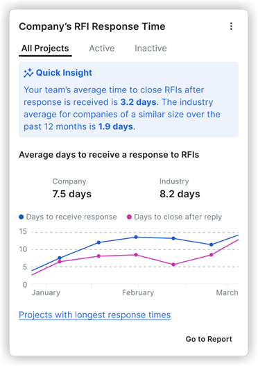 Tracks how long it takes for RFIs to be responded to across all projects. Key metrics include company-wide RFI response time, industry benchmark comparisons, and projects with the longest response times. Users can filter by All Projects, Active, or Inactive projects. The Quick Insight area lets you see the performance of your company against the industry's average response time.