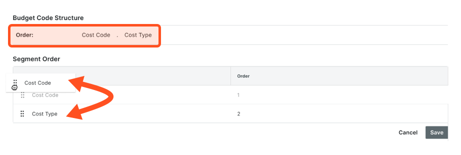 You can arrange the segments in your company's budget code structure in any order you want. The segment order goes into effect on your new project(s).