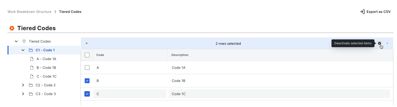 In this example, we have highlighted a Tier 2 segment named 'C1-Code 1' and want to deactivate two (2) codes named 'B - Code 1B' and 'C - Code 1C'. Neither one of these codes has children.