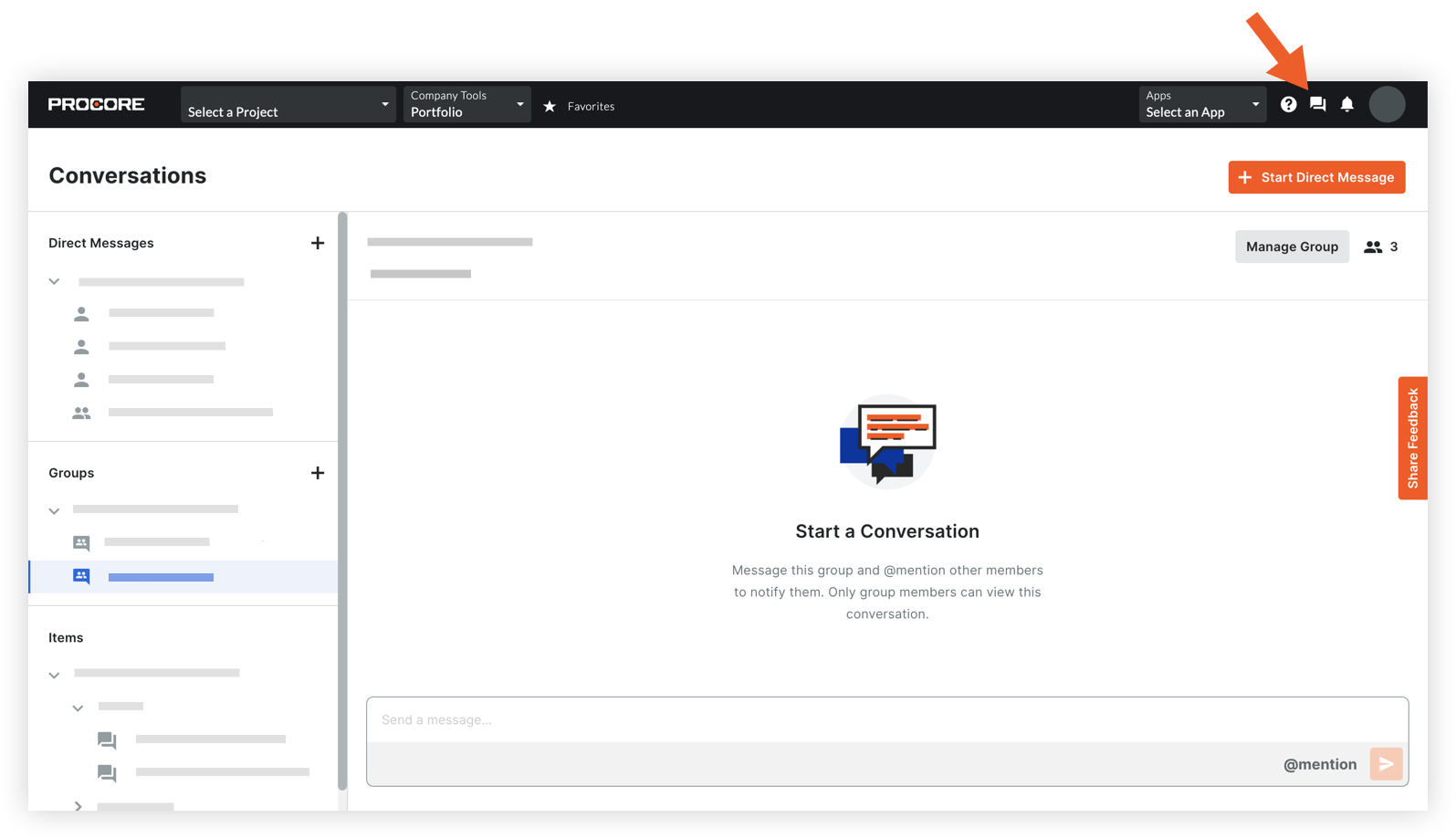 icon in the Procore header, you will see your own view of the Conversations tool, where you can view and respond to direct messages, group messages, and item conversations for all of your projects within a Procore account. If you belong to projects for different companies in Procore, you will only see project conversations for the company that you are currently logged into Procore for.