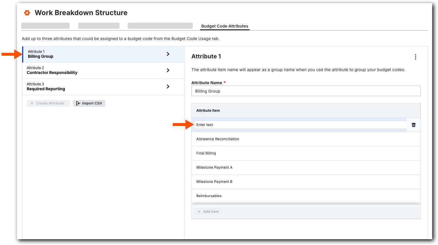 Once attributes are created, add an unlimited number of items to each. This allows for specific filtering and grouping of your budget data. Highlight the attribute to add items to it. You can change the Attribute Name, enter text in the Attribute Item box to add an unlimited number of items, and click the delete icon to remove an item. You can also import a spreadsheet to add long lists of items for each attribute.