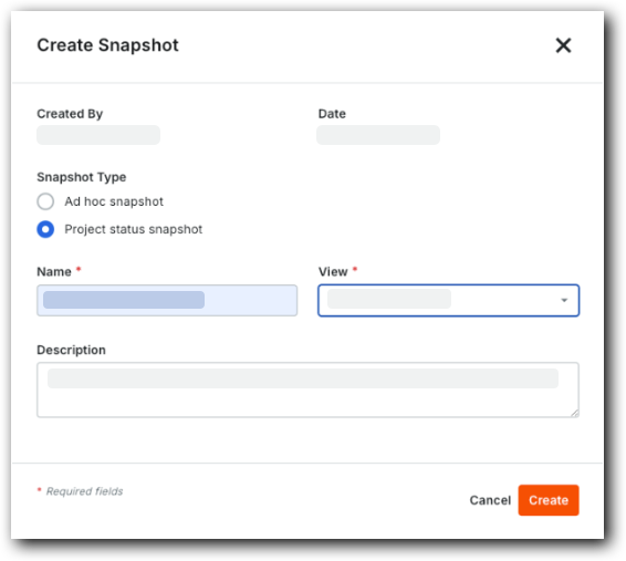 The Create Snapshot window in the Project level Budget tool contains these options to create snapshots. To learn more about snapshots, see Create a Snapshot from the Budget Tool and What is the difference between an ad-hoc snapshot and a project status snapshot?