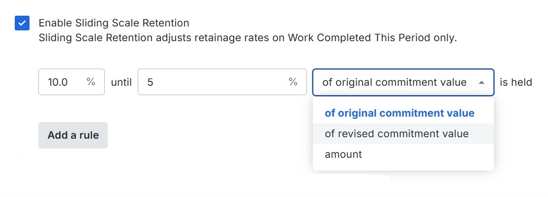 This rule lets you hold back X percent of the revised commitment amount until Y percent of the revised commitment's value is held. The revised commitment amount is the amount after change orders are approved.