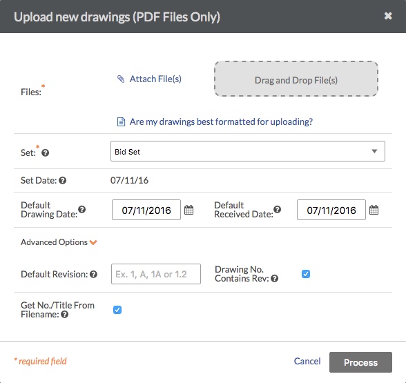 - Drawings > Upload Drawings > Upload Drawings > Advanced Options tooltip